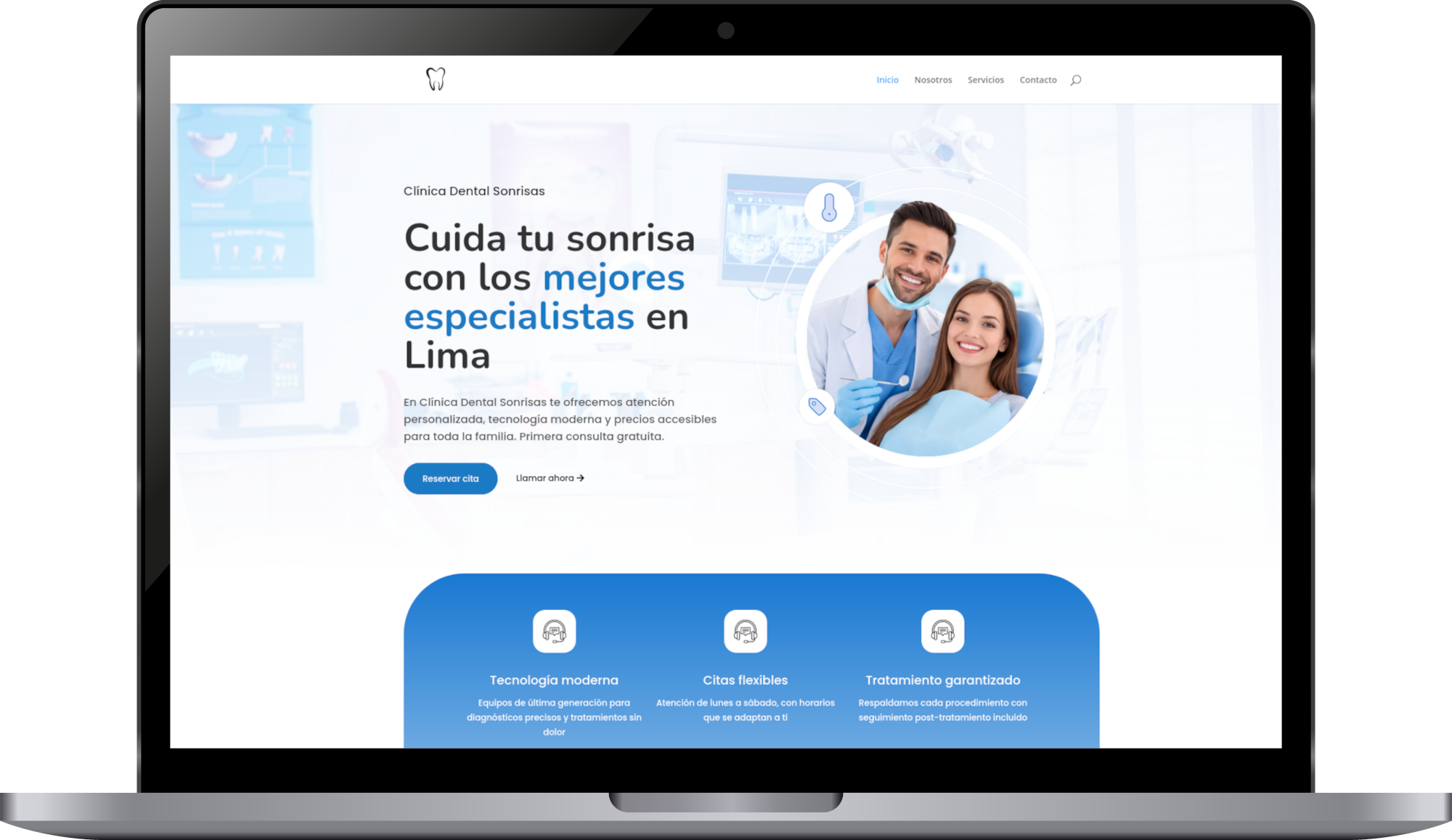 Web informativa para consultorio dental con servicios, galería de resultados, testimonios y formulario de citas.